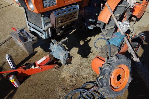 大掛かりになってきた・・! 今日は朝からいい天気ですので、トラクタのオイル交換をしました! まずは前輪のギアケース(左右二か所)と中央のデフのケースのオイルから替えていきます。 上の写真は作業しやすくするためにタイヤを外したところです。ついで…