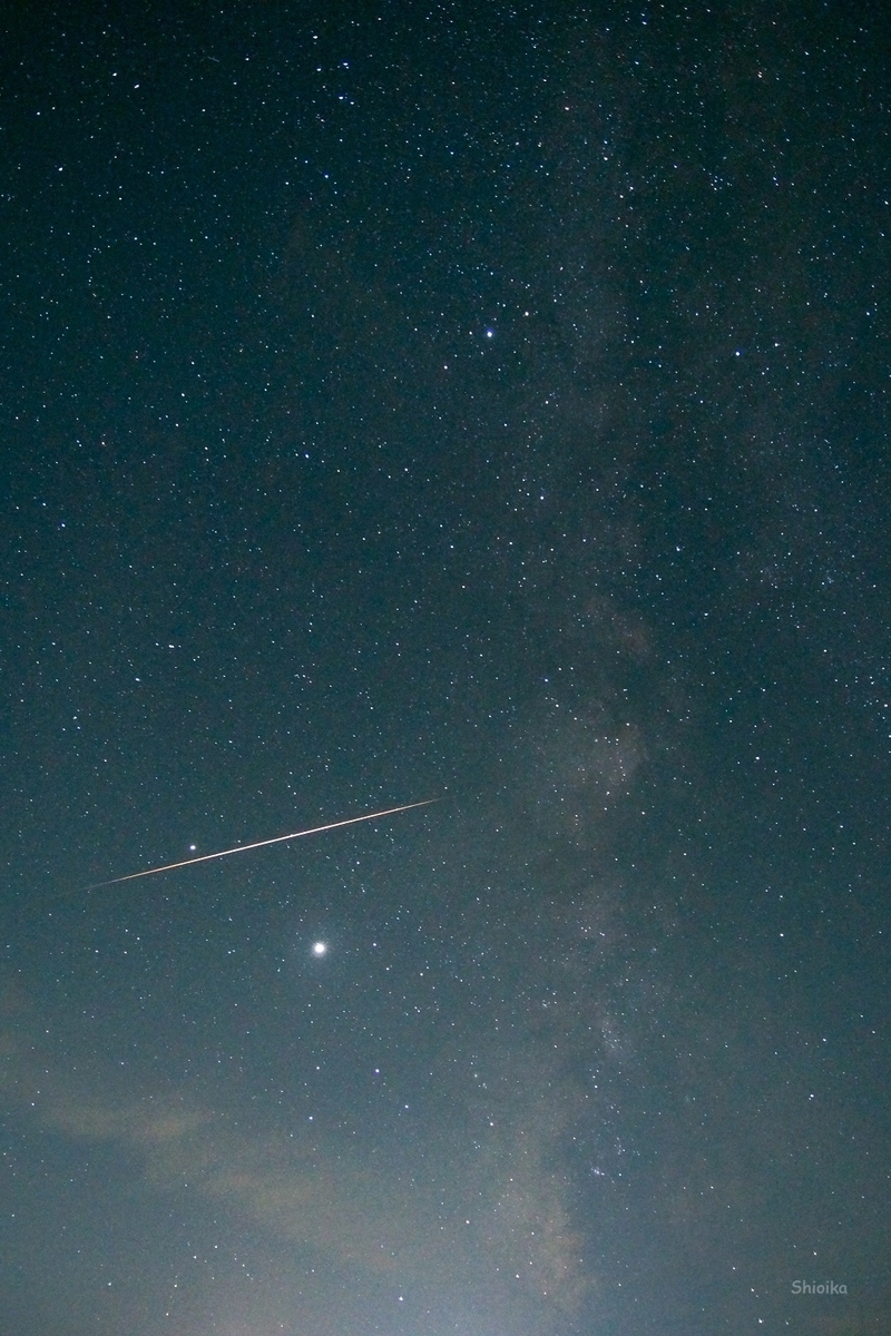 2020-08-18 ペルセウス座流星群・流れ星撮影2回目! 天の川と一緒に 写真・カメラ 星空撮影 SONY α57 + SIGMA 18-50 f2.8 <ISO3200,SS15秒,f2.8> おとといの8月15日も、流れ星の撮影にチャレンジしました。 いつもとは構図を変えて、縦での撮影です。 2日目でようやくまともな(?)流れ星を撮影することができました!! Exifで確認すると、23時20分ごろのようです。 インターバル撮影だったので、目で見ることはできなかったのが残念・・。 でも、運よく天の川と一緒に撮影できたのでとても良かったです!