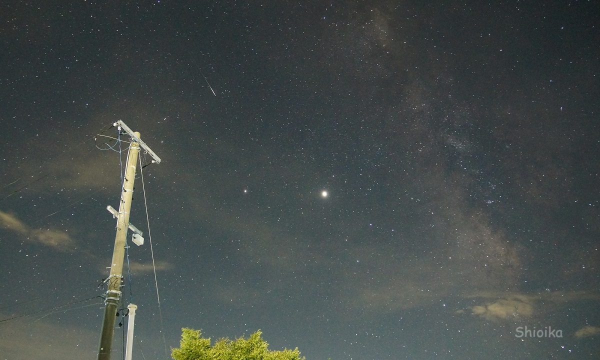 これ、撮影時には気付かなかったのですが中央のちょっと左上あたりに流れ星?みたいな光の線が写っていました。(拡大してご覧ください)