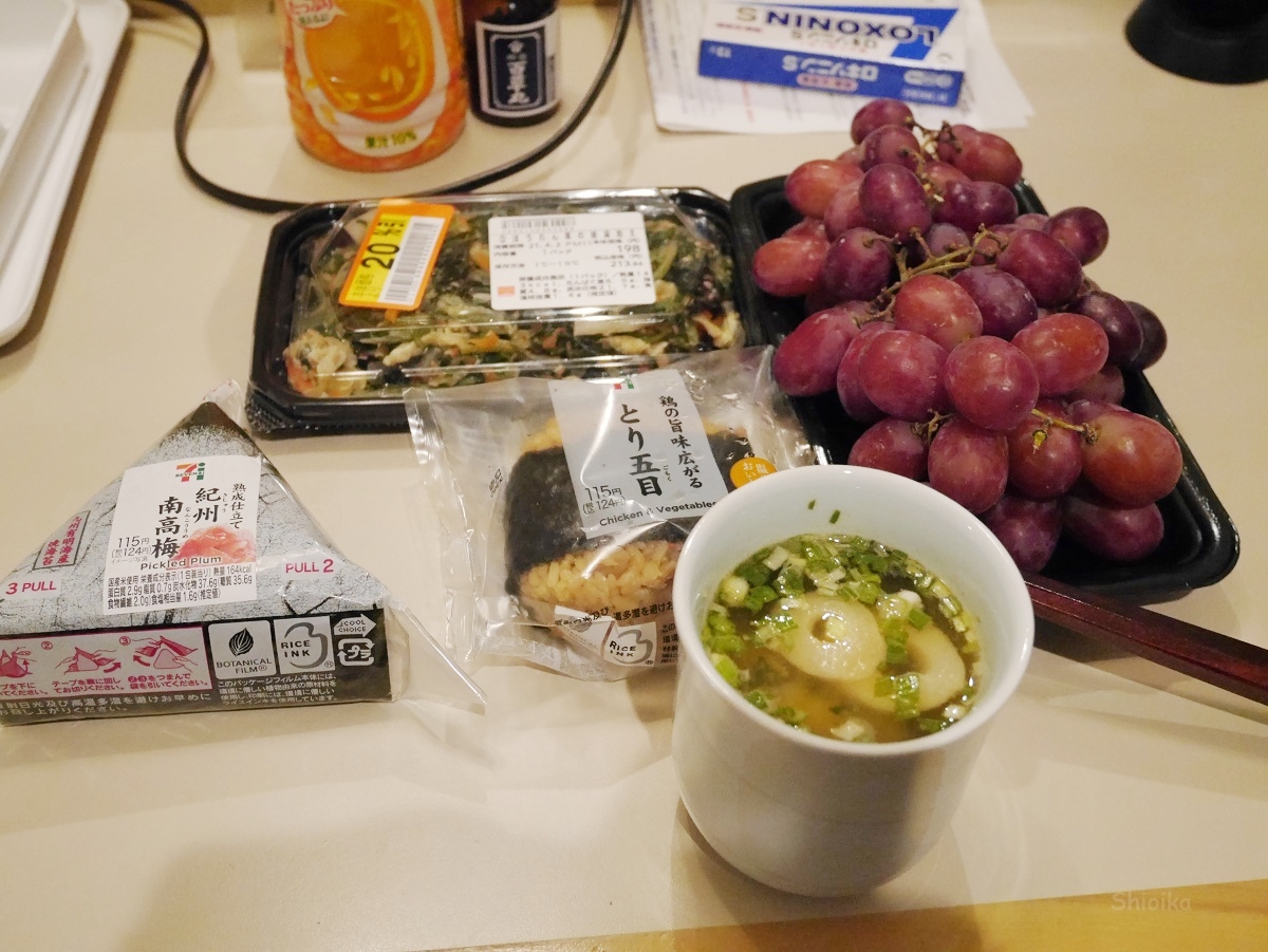 今日の晩ごはんは朝の残りのおにぎりと、ほうれん草の胡麻和え、スーパーでつい買ってしまった輸入物のぶどう。味噌汁はわかめです。