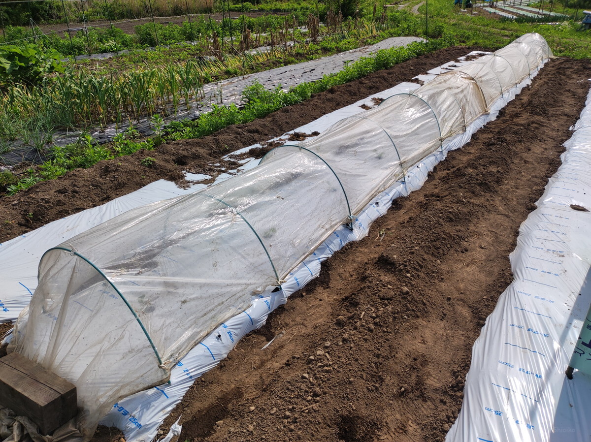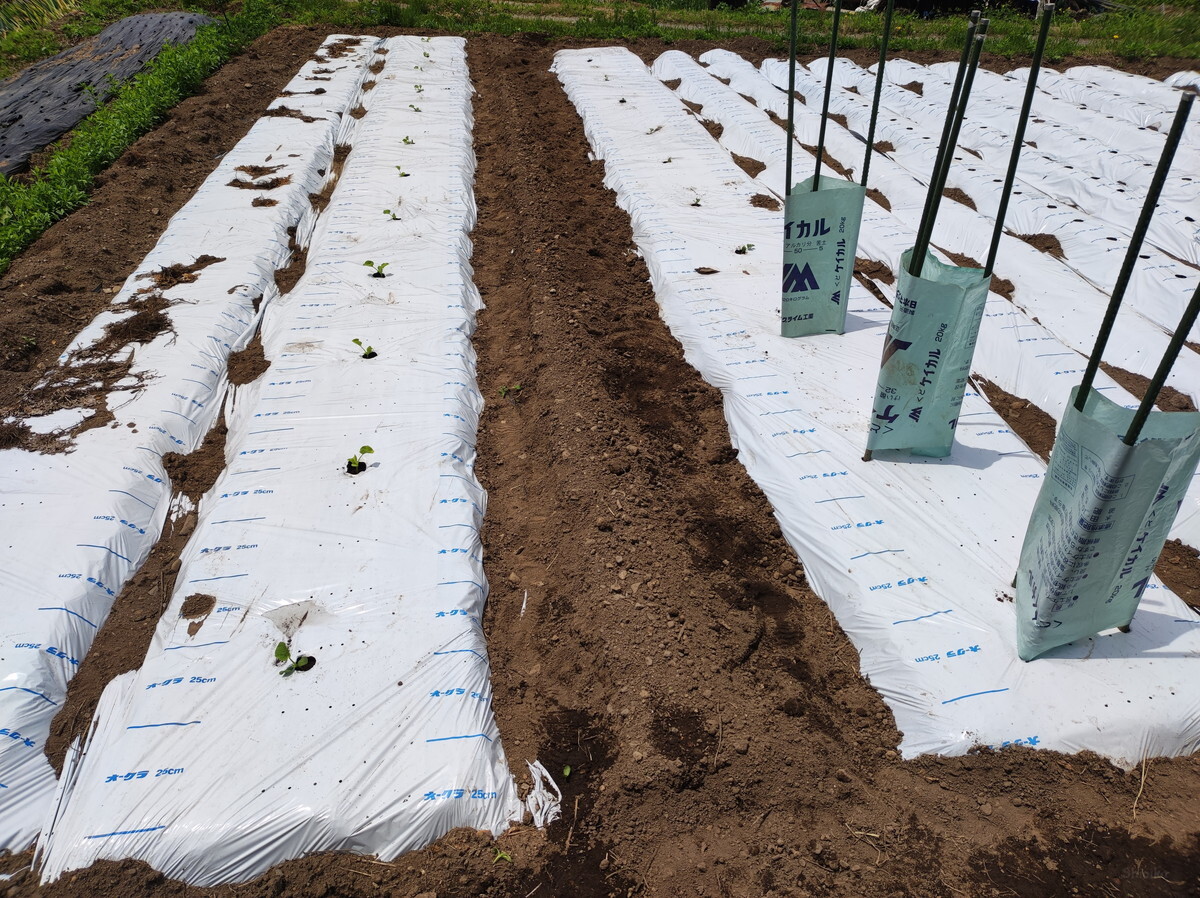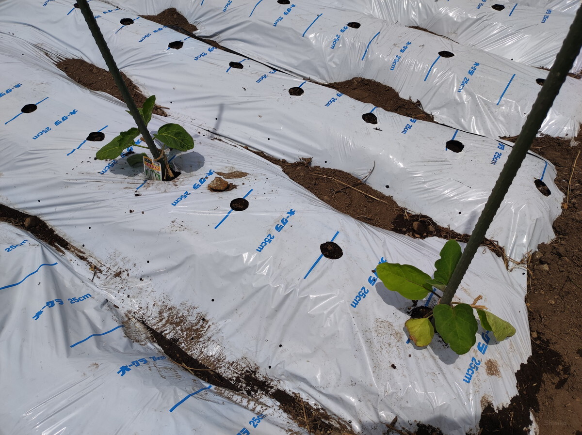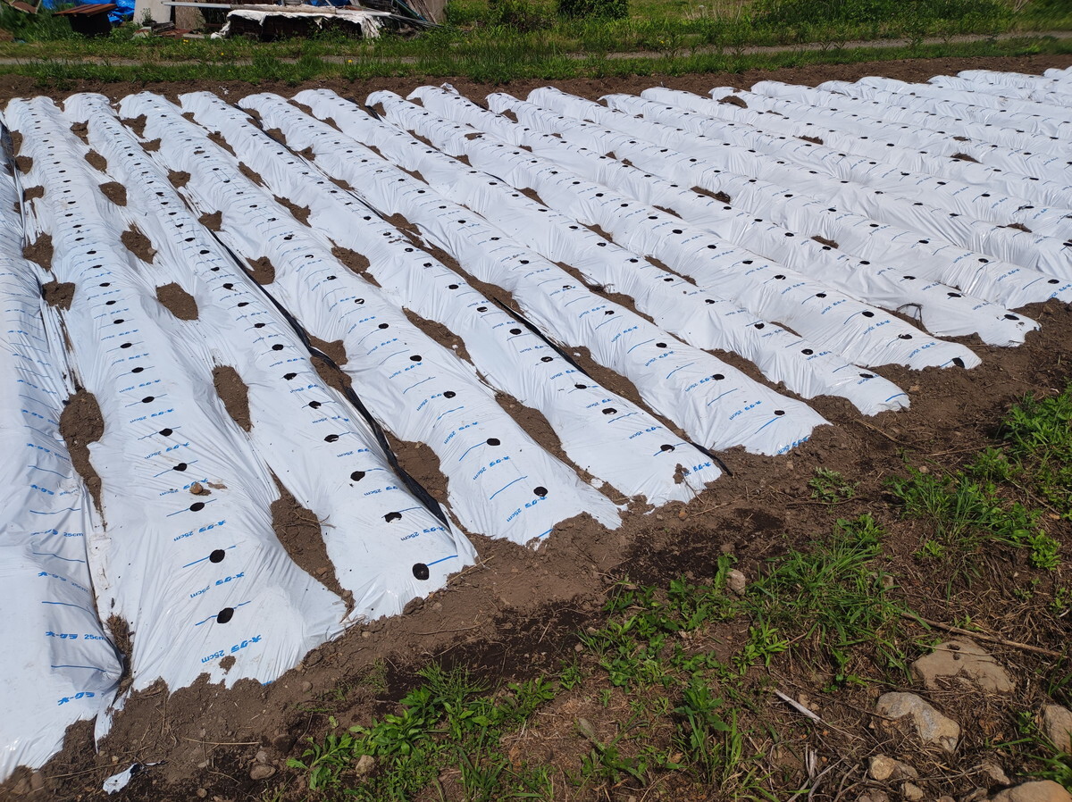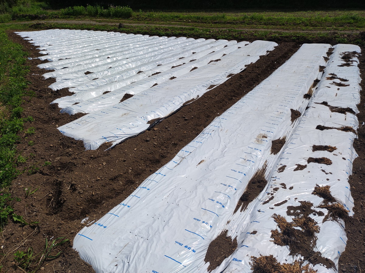深く考えずに写真の向きでマルチを張りましたが、列が多くなってしまうのでやってみると結構大変。来年は90度向きを変えて、列を減らしてみようと思います。