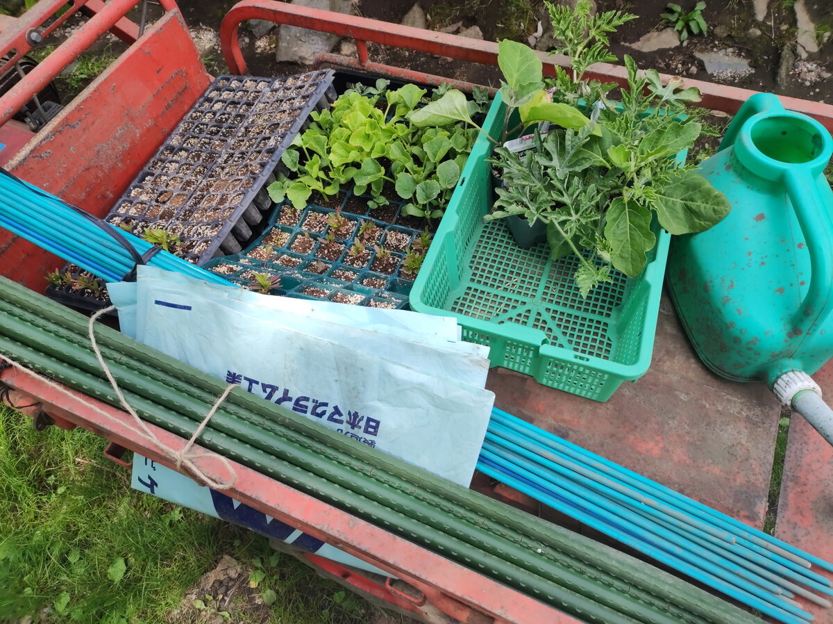 苗とジョウロ、支柱などを載せて畑へGO!