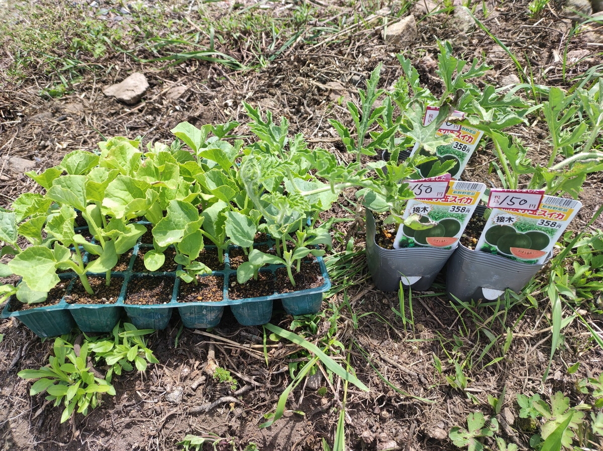スイカもやります。右に写っている3本は買ったもの、その他は種から。霜に当たって少し葉が焼けたものが安売りされていたのでつい買ってしまいました(笑) 皮が黒い品種ですね。