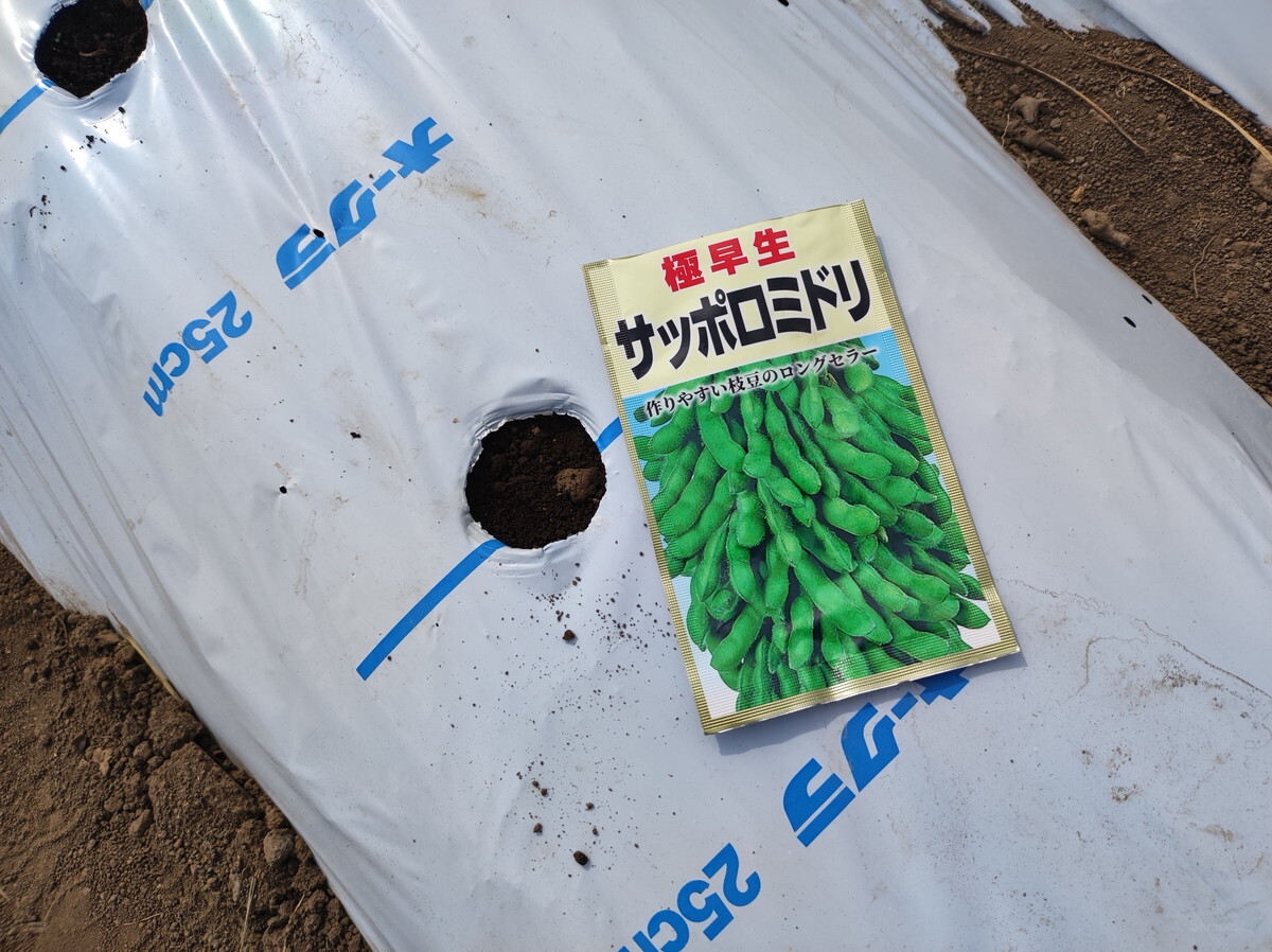 枝豆の種を蒔きます。これも初めてやる品種・・サッポロって名前だけで美味しそう。
