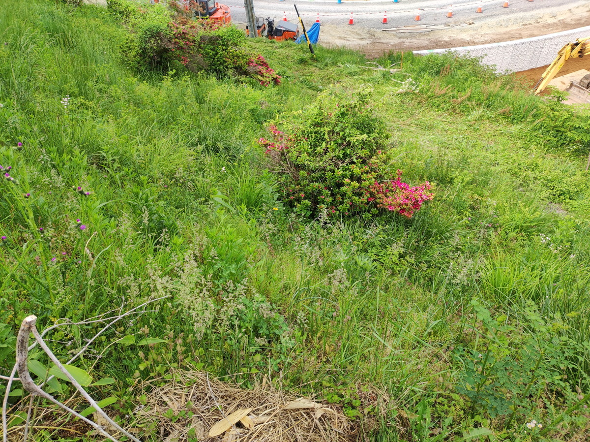 せっかくのつつじが草に埋もれてしまってます。以前は道沿いにたくさんあったつつじも、道路工事でめっきり数を減らしました。残っているのはここだけなので全力で守っていこうと思います。