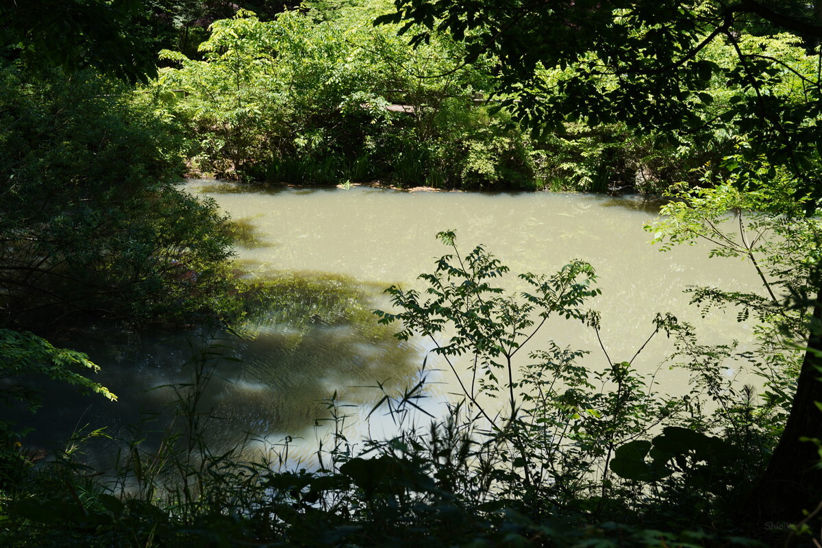 登山口から入ってすぐに「竜神池」という小さな池が見えてきます。雨のせいか濁ってますね・・。