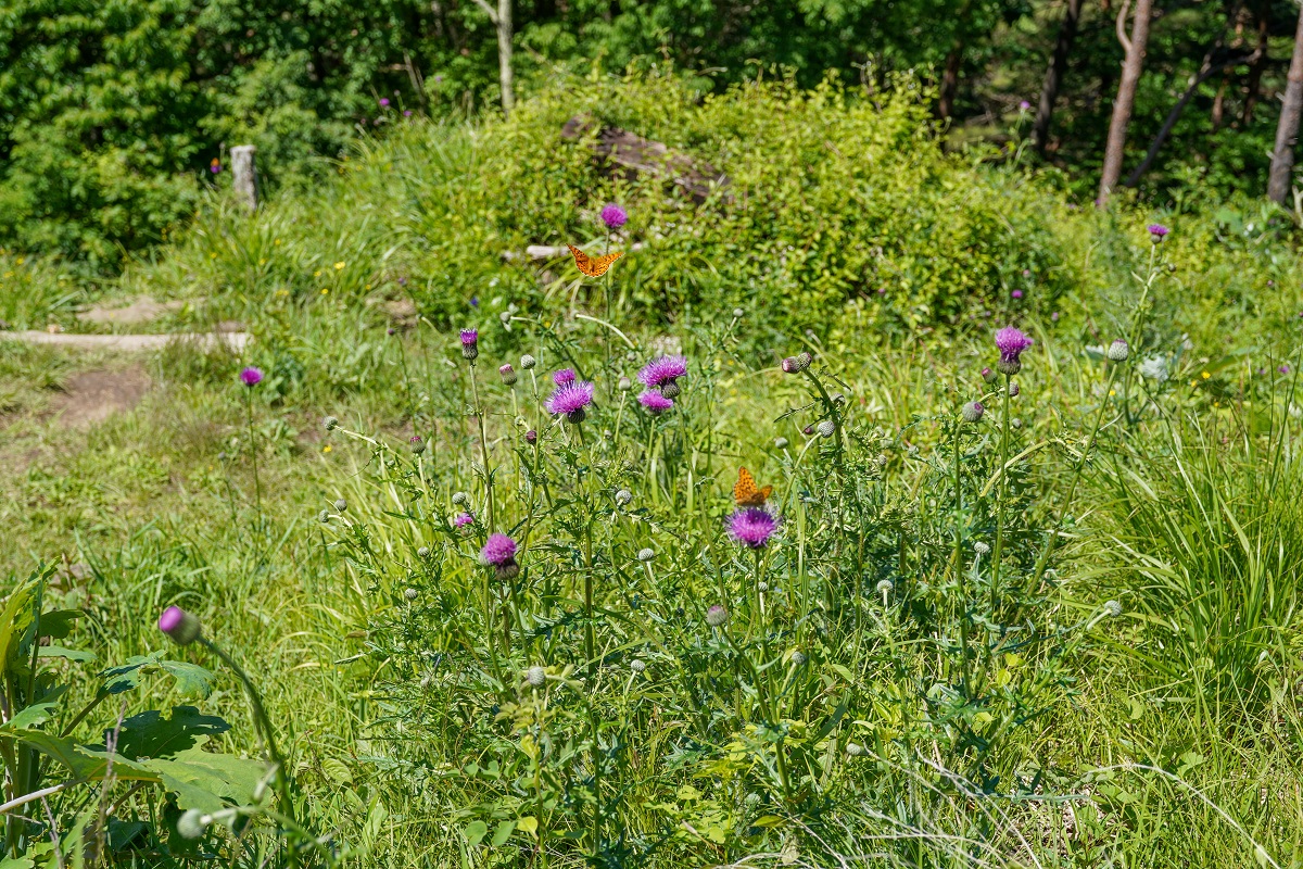 山頂付近はまるでお花畑!アザミやあやめなど色とりどりの花が咲いていました。