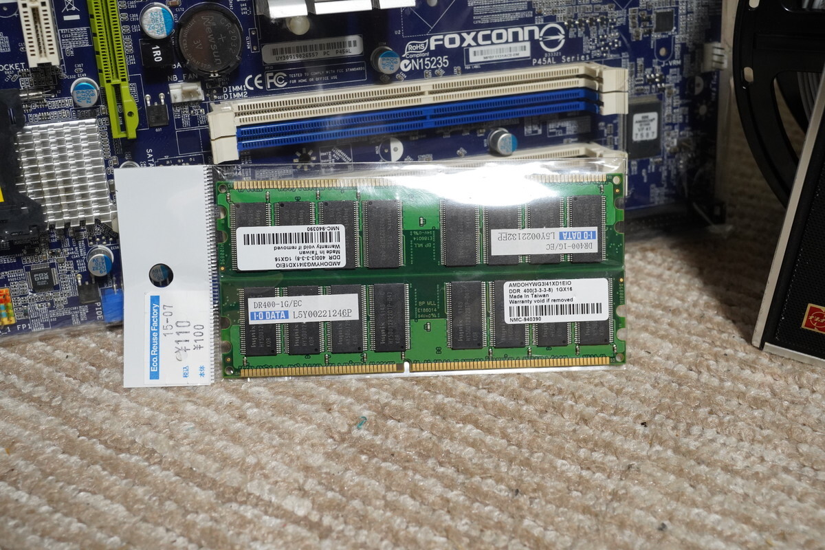 続いてPC用メモリ2枚110円。ありそうでないDDRの1GB2枚です。