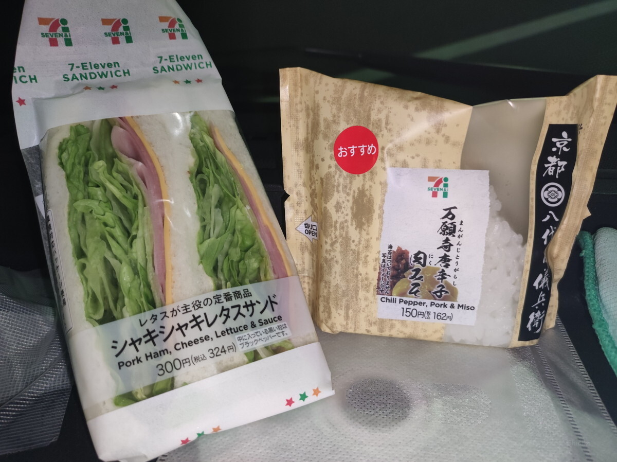 朝ごはんタイム! コンビニのおにぎりとサンドイッチにしました。